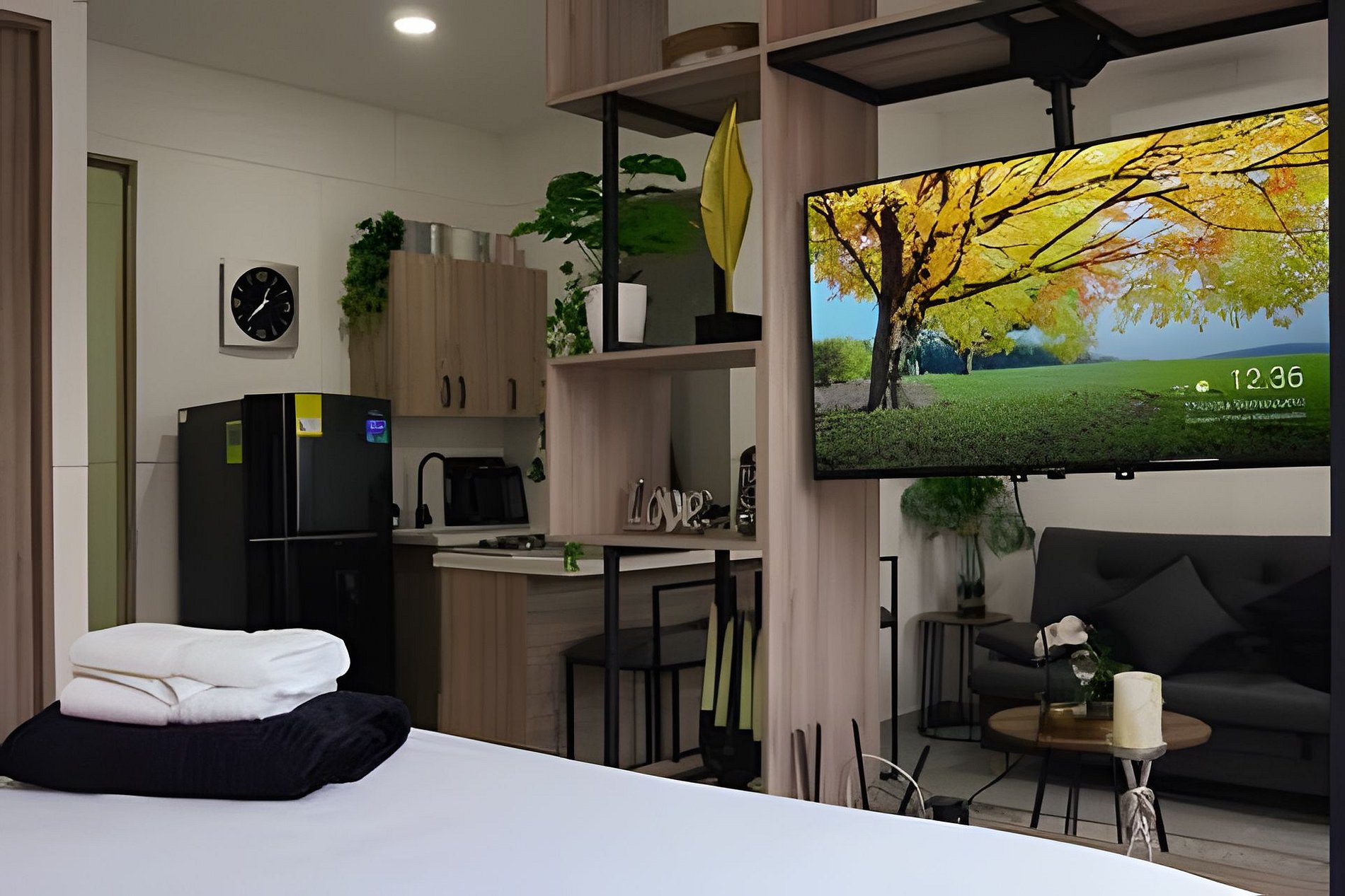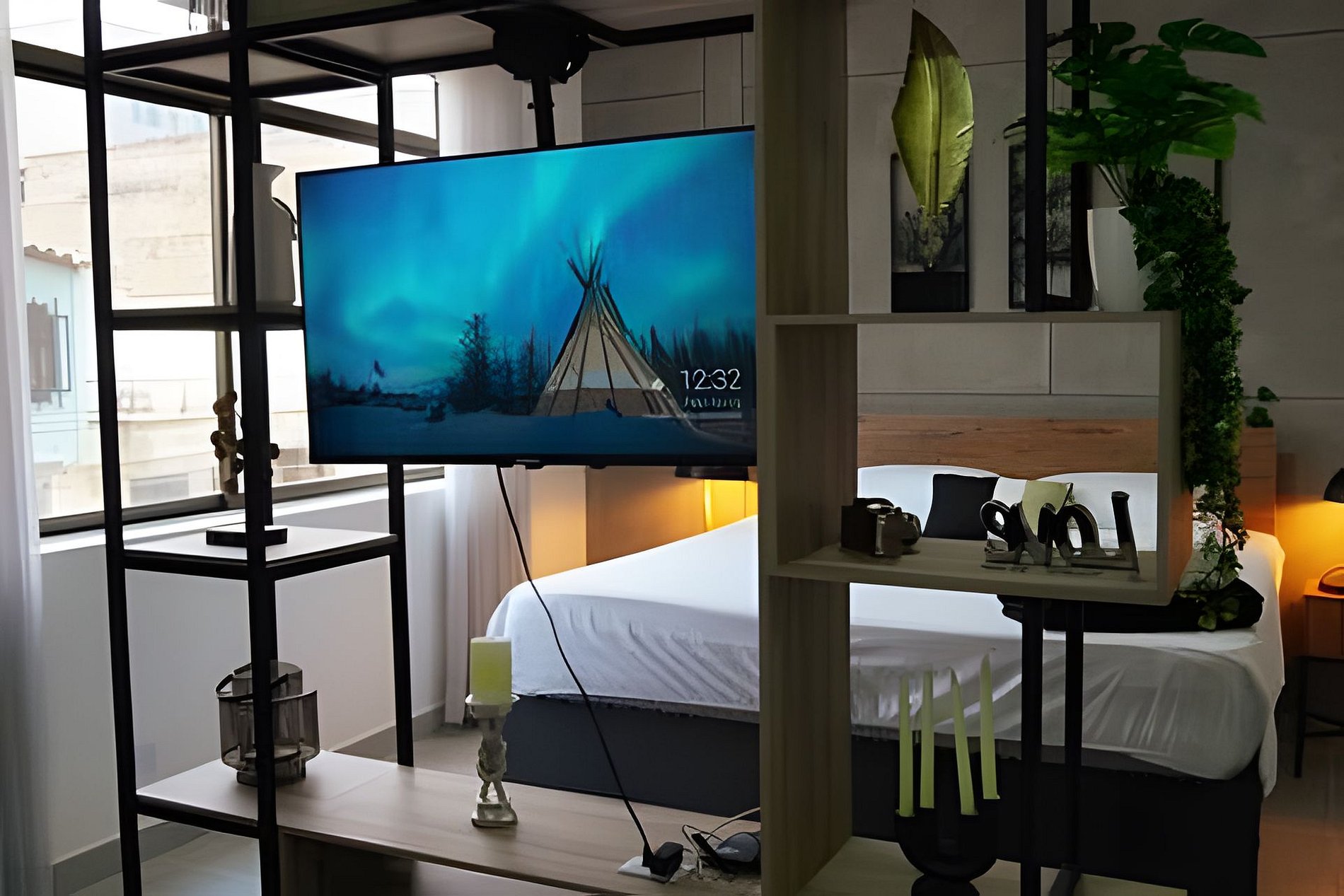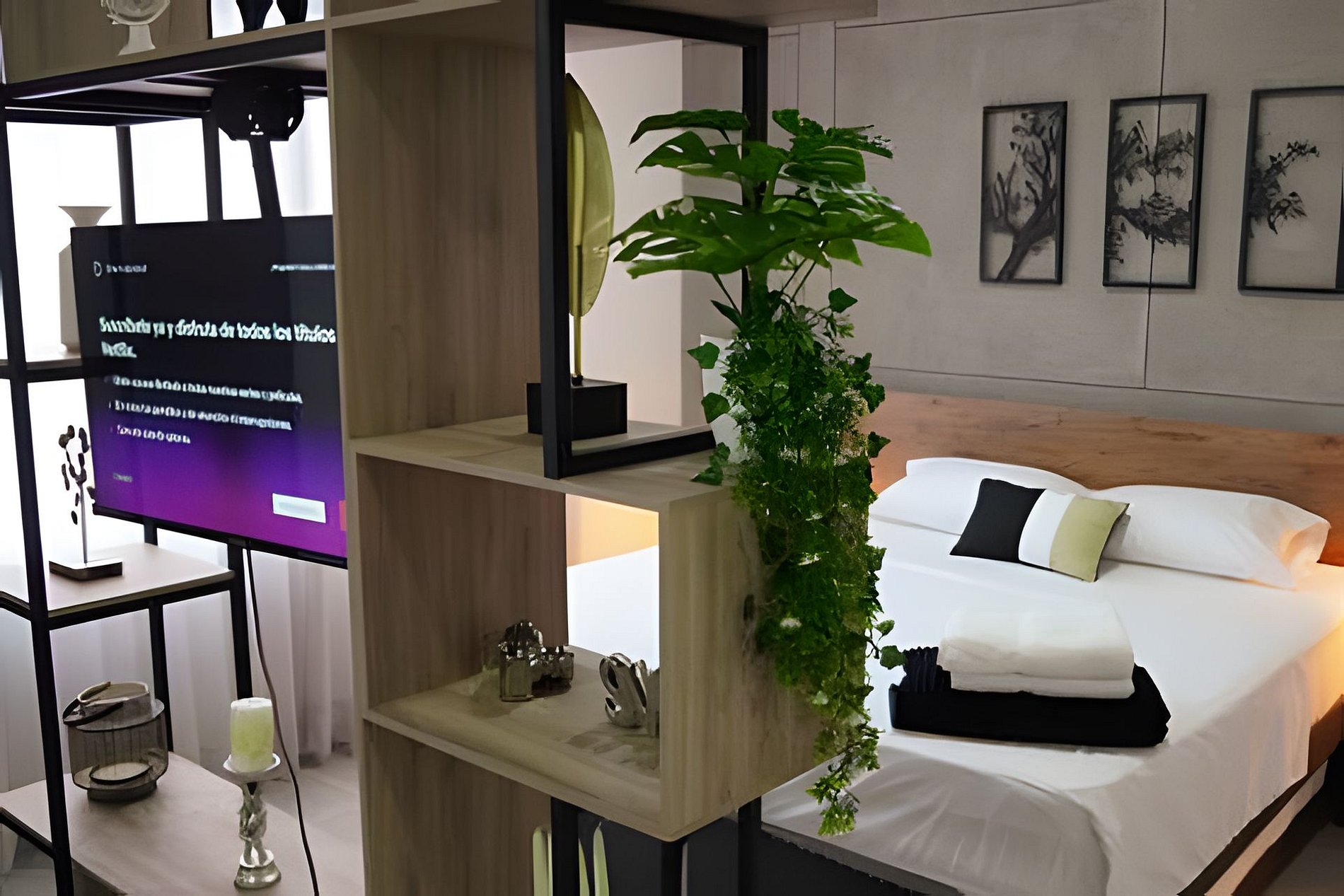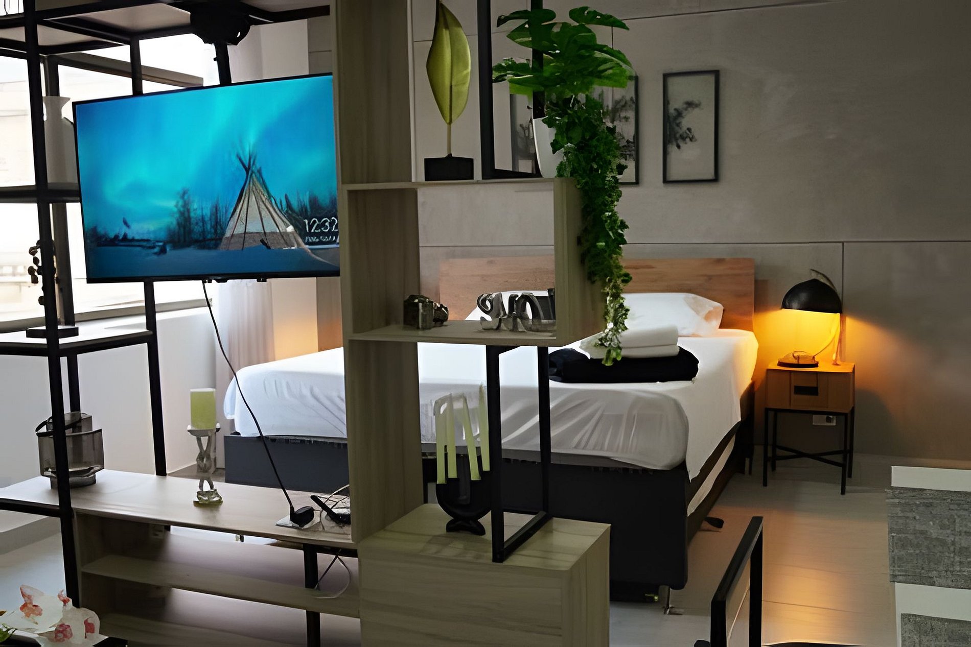 Este hermoso apartaloft tiene un hermosa división con tv que puedes girar y disfrutar la tv desde la comodidad de la cama, la barra americana o sofá ..